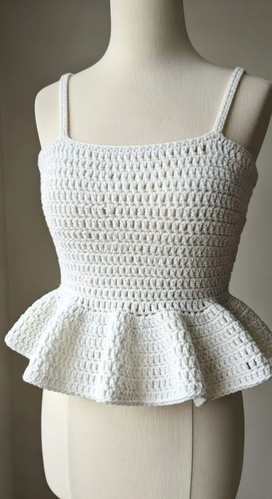 Peplum silhouettes add a gentle, flattering flare around the waist. When made in white yarn with a structured stitch, the shape feels fresh instead of frilly.