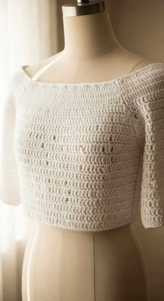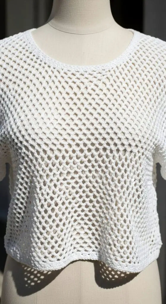 A mesh top sounds bold, but in practice, it’s incredibly wearable. With the right stitch spacing, you get a breezy summer piece that layers well over camis, swimsuits, or bandeaus. It’s lightweight and stitches up faster than dense tops.