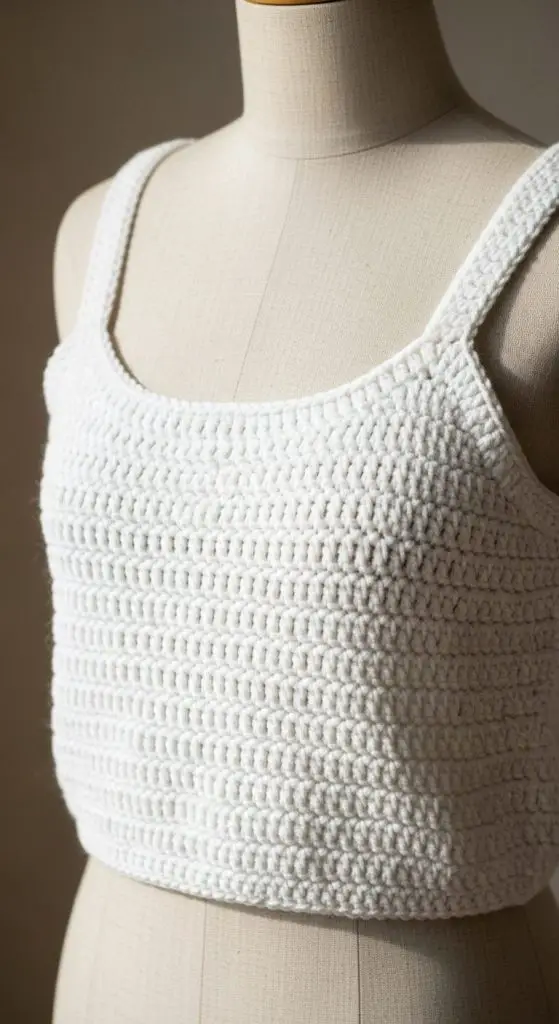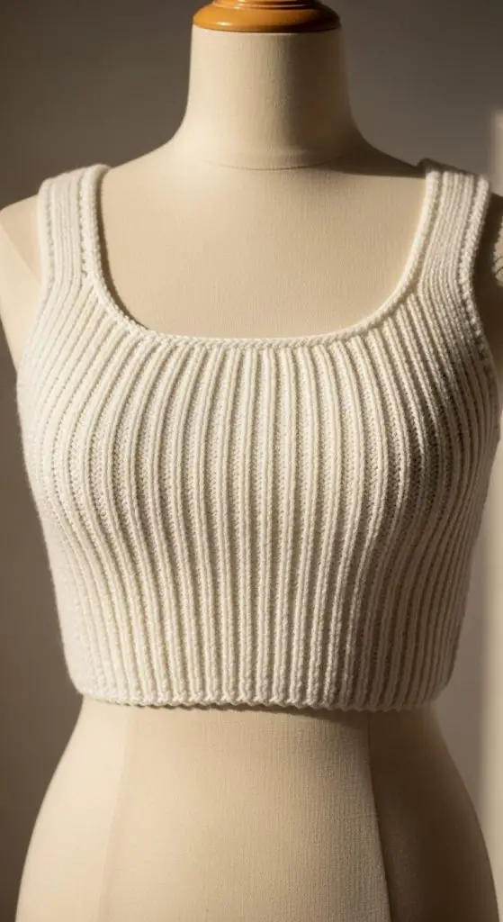 Ribbing adds that sporty, minimalist vibe—exactly the kind of top you see styled with high-waisted denim or flowy skirts. This pattern usually uses slip-stitch or back-loop-only rows to mimic knit ribbing.