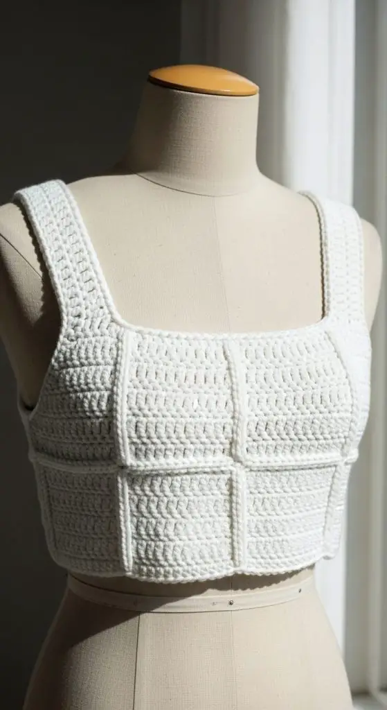 A square neckline feels surprisingly modern, even though it’s been around forever. It frames the collarbone beautifully, and in a crisp white cotton yarn, it looks elevated enough for casual dinners or weekend photos.