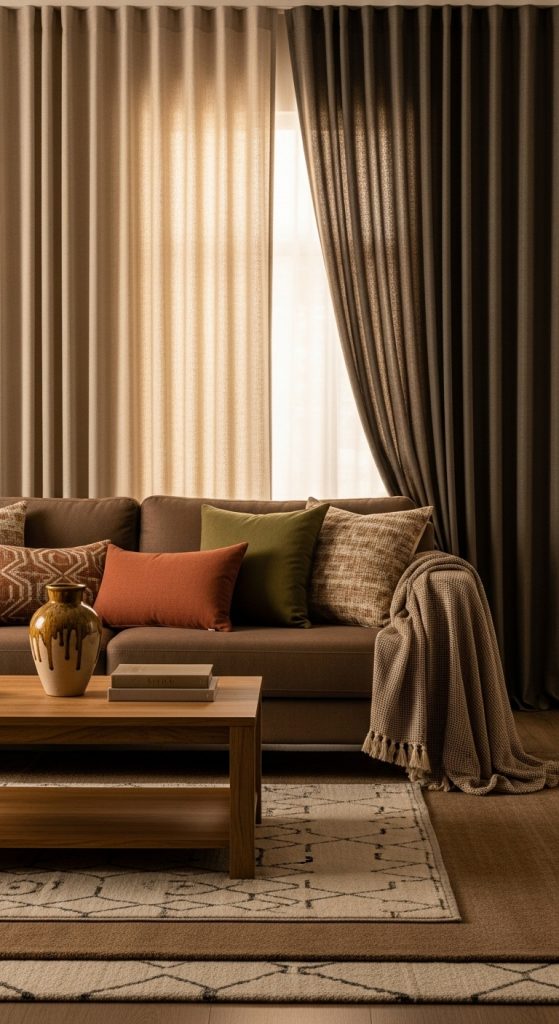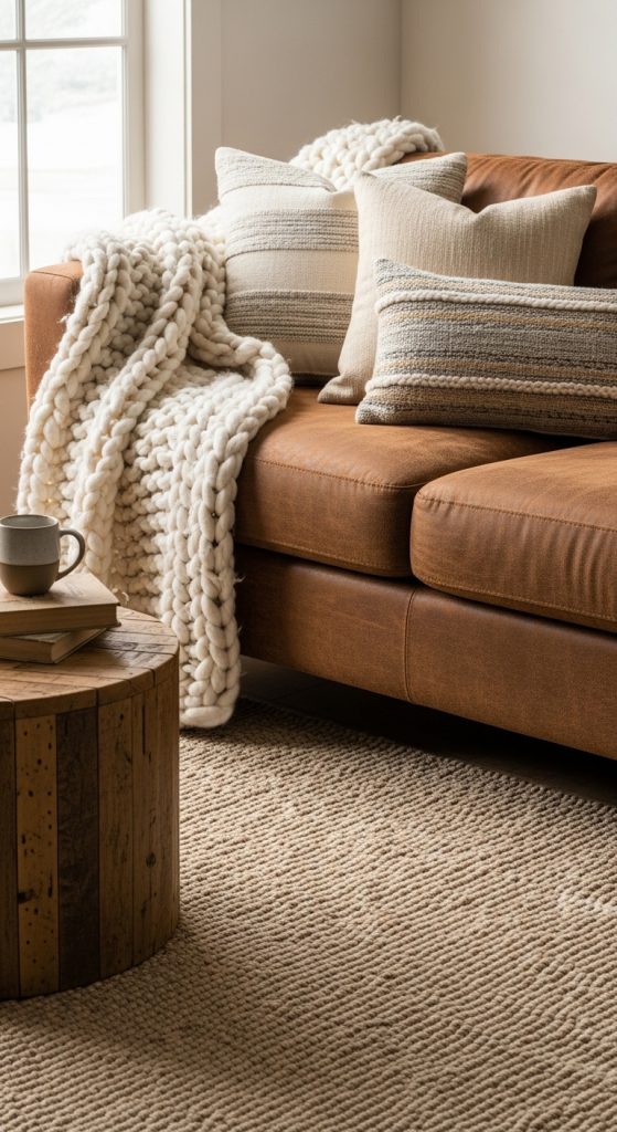 Throw blankets, knit poufs, or even a chunky wool rug—layering textiles keeps your brown couch looking warm and inviting.