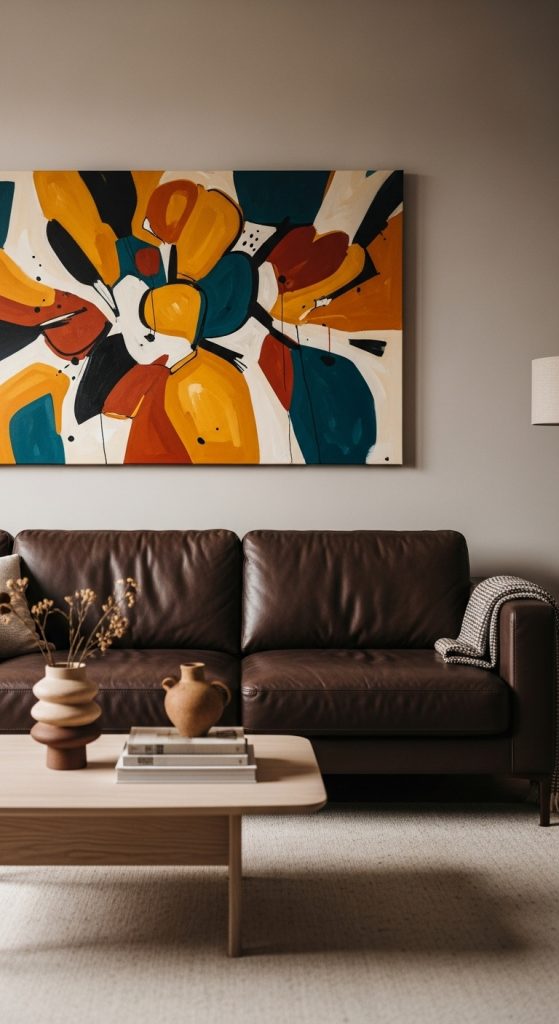 Balance the traditional feel of a brown couch with abstract or modern wall art in bold colors.