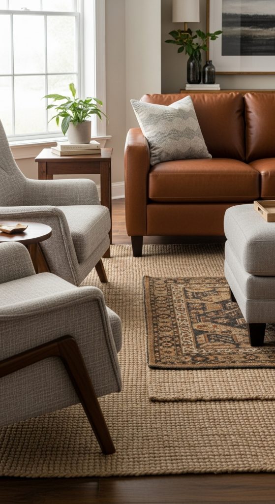 Got a leather brown sofa? Balance it with fabric chairs or ottomans to soften the look.