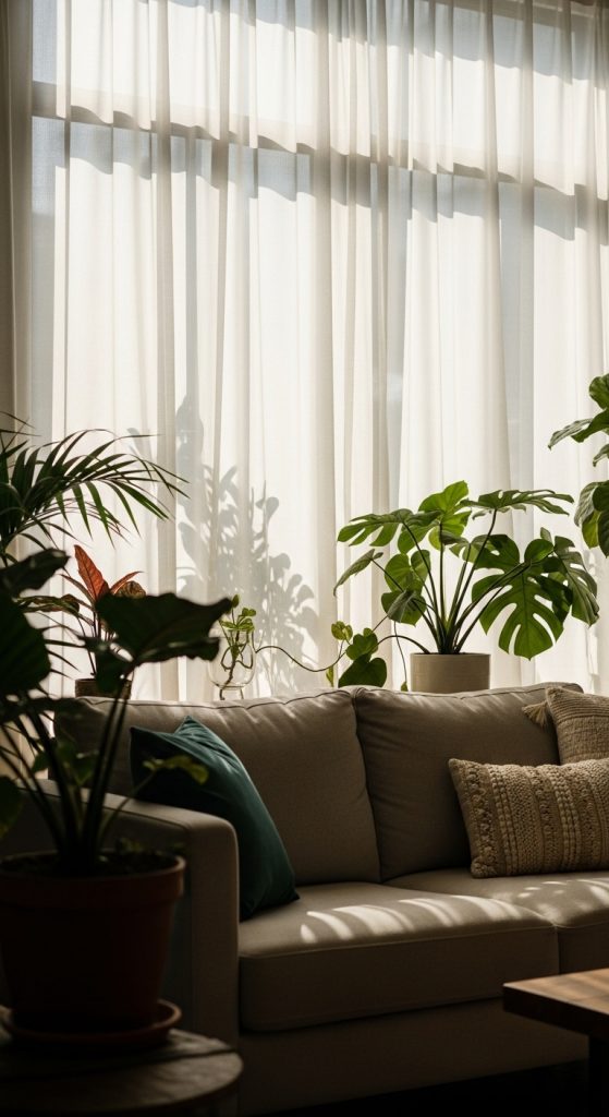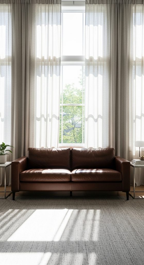 Dark sofa + dark curtains = cave vibes. Instead, go for light, airy curtains to balance your brown couch.