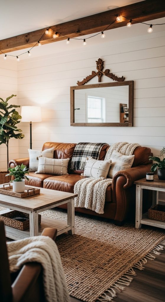 Brown couches fit perfectly into the farmhouse style with distressed wood, shiplap, and cozy textiles.
