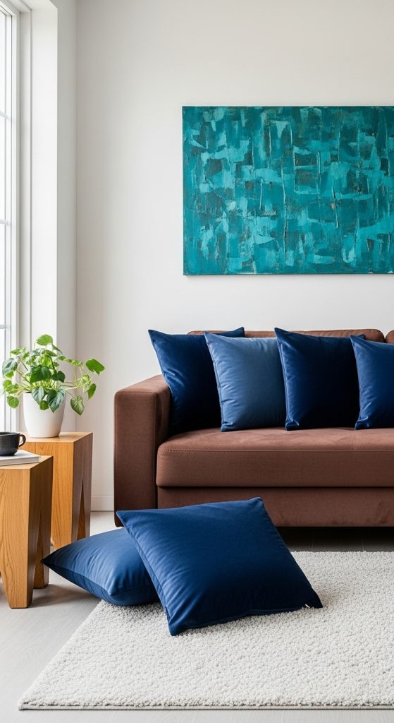 Here’s a little design trick: blue + brown = magic. Navy throw pillows, teal art, or even a bold blue rug can make your sofa shine.