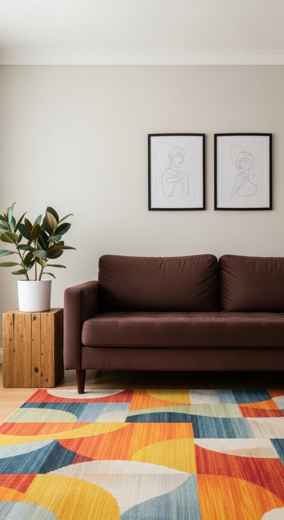 Ever noticed how a rug can completely transform a room? Pair your brown sofa with a patterned or vibrant rug to anchor the space.