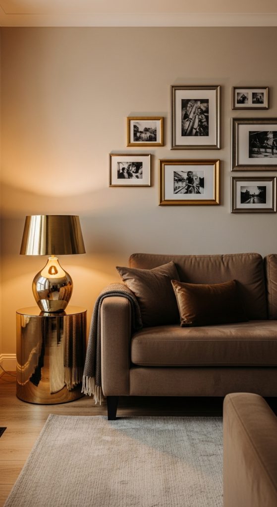 Want a touch of glam with earthy tones? Bring in gold or brass accents through lamps, frames, or side tables.