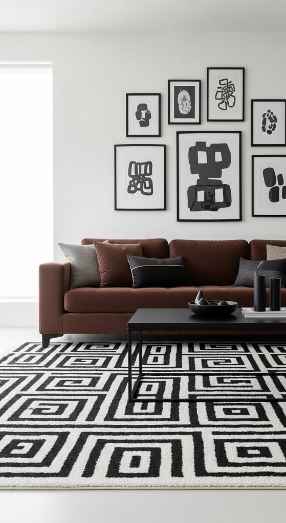 Want something bold yet modern? Brown sofas actually look amazing with a black-and-white color scheme.