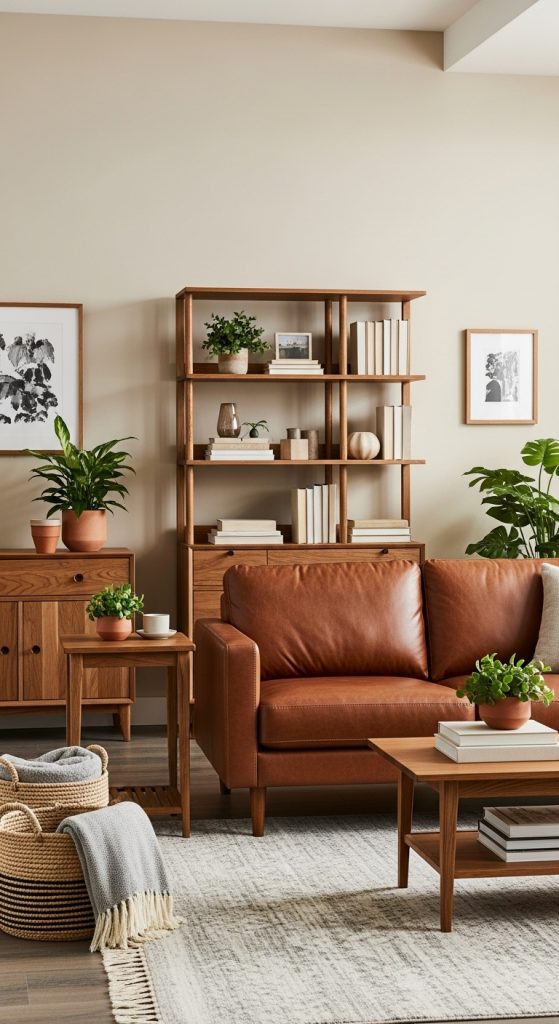 Brown couches already scream “earthy,” so why not lean into it with wood accents—coffee tables, shelving, or sideboards.