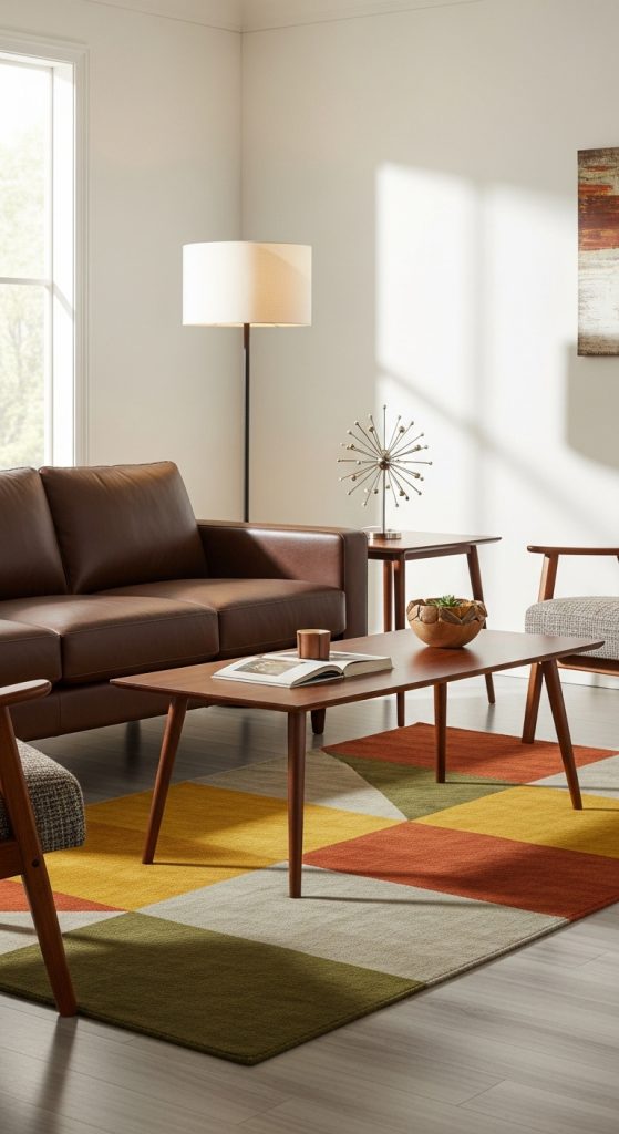 If your couch leans leather or sleek, pair it with mid-century modern pieces like tapered-leg tables and retro lighting.