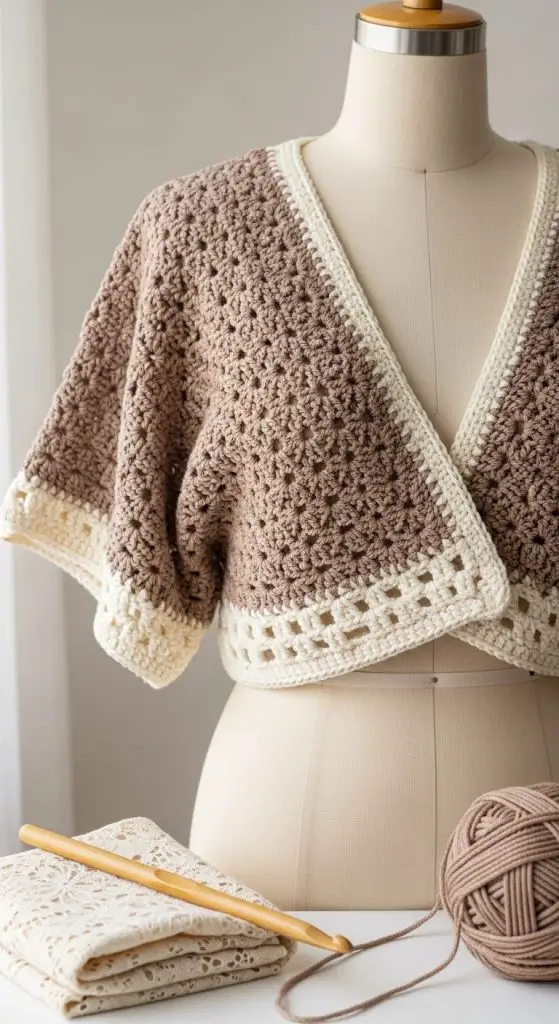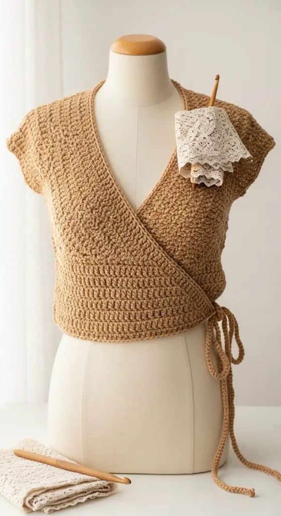 Wrap-style crochet tops mimic the elegance of a wrap blouse but keep the texture casual and handmade. Adjustable ties allow custom fit.