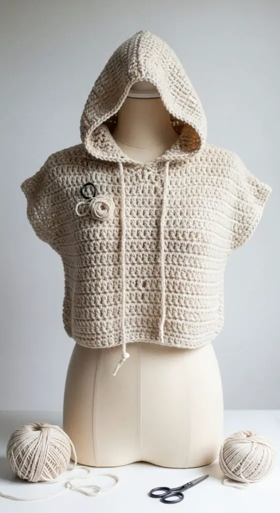 A crochet hoodie blends sporty and handmade aesthetics. Lightweight yarn keeps it breathable, perfect for transitional weather or evening walks.