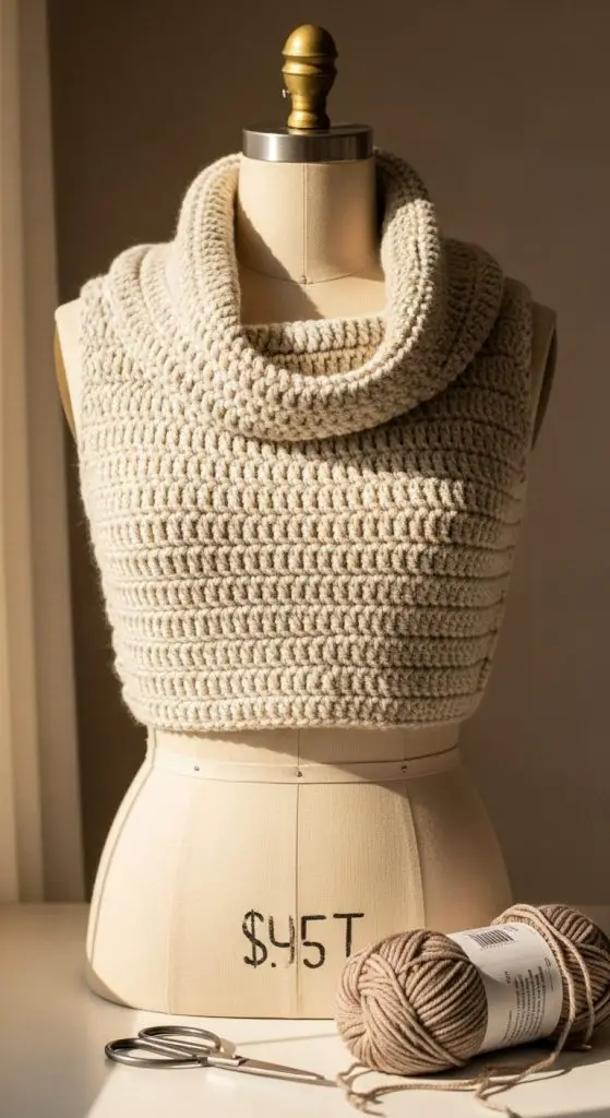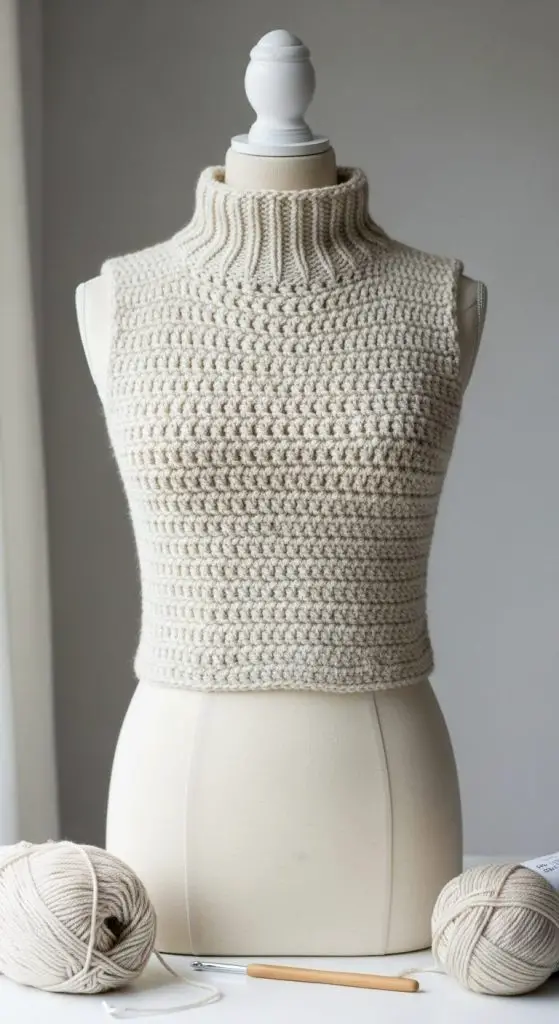 Mock turtleneck crochet tops are surprisingly versatile. Lightweight yarn makes it suitable for layering, while the neckline adds subtle sophistication.