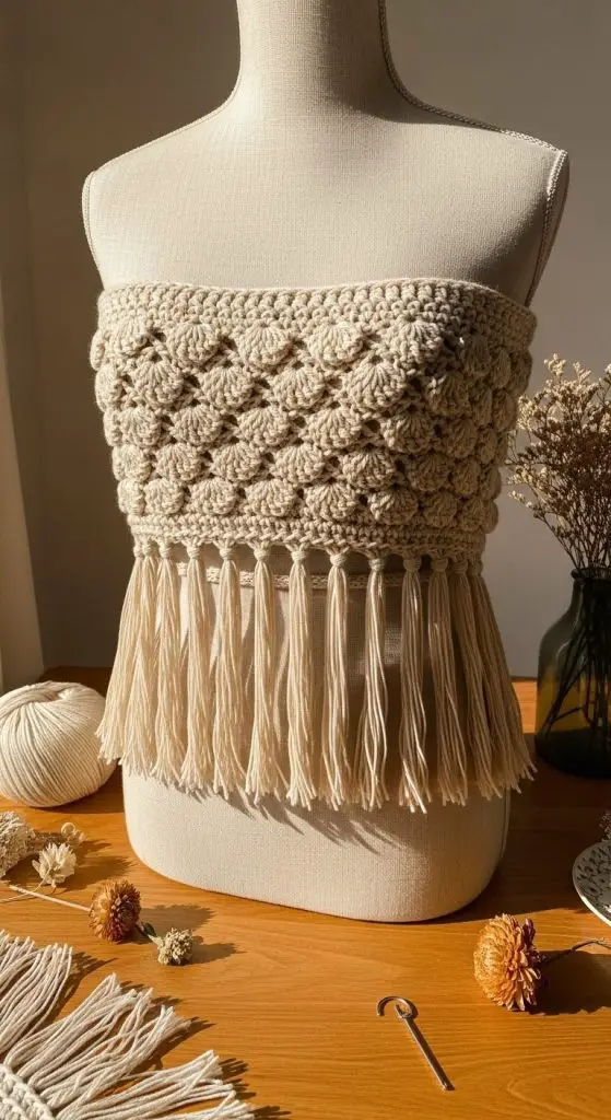 If you naturally gravitate toward breezy, slightly bohemian outfits, a tube top with fringe adds that carefree touch without looking over the top. The fringe draws the eye downward, creating a soft movement that feels beautiful during evening walks or outdoor events. It’s one of those designs that instantly gives a handmade outfit charm.
