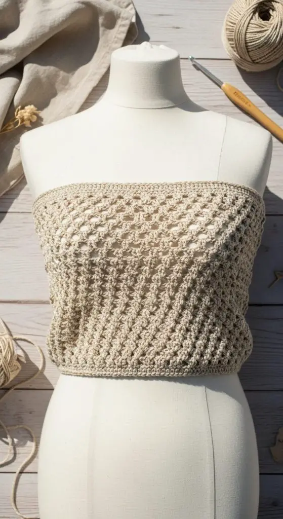 Warm beach days call for something lightweight, breathable, and easy to dry. An open-weave crochet tube top hits all those points. It works perfectly as a swim cover or for seaside strolls. Using linen-blend yarn keeps it airy and quick-drying.