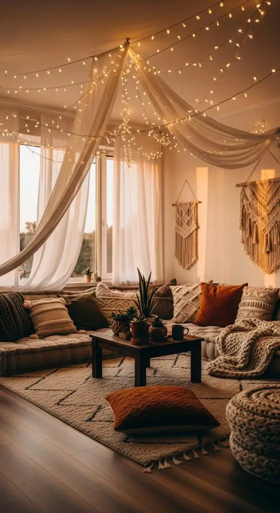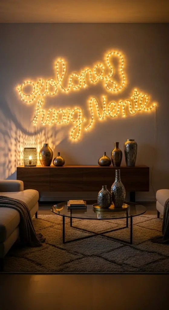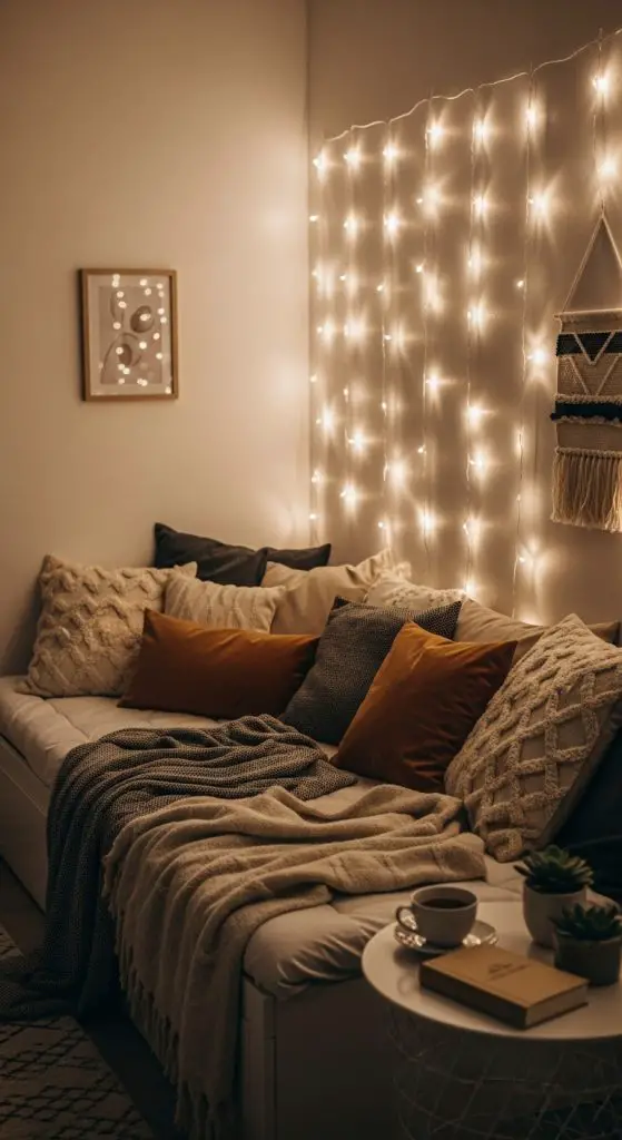 Hanging fairy lights like a glowing curtain behind your sofa creates an instant focal point. It’s like giving your living room a cozy halo.