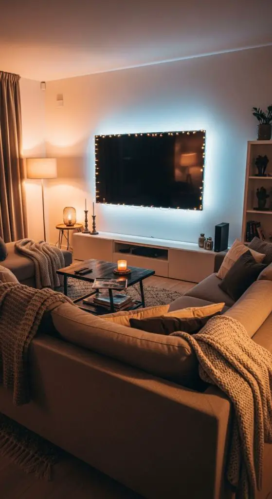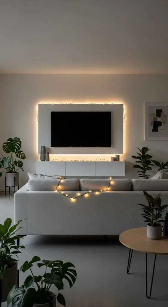 Wrapping fairy lights around your TV frame might sound odd, but it adds a soft backlight that makes binge-watching way cozier.