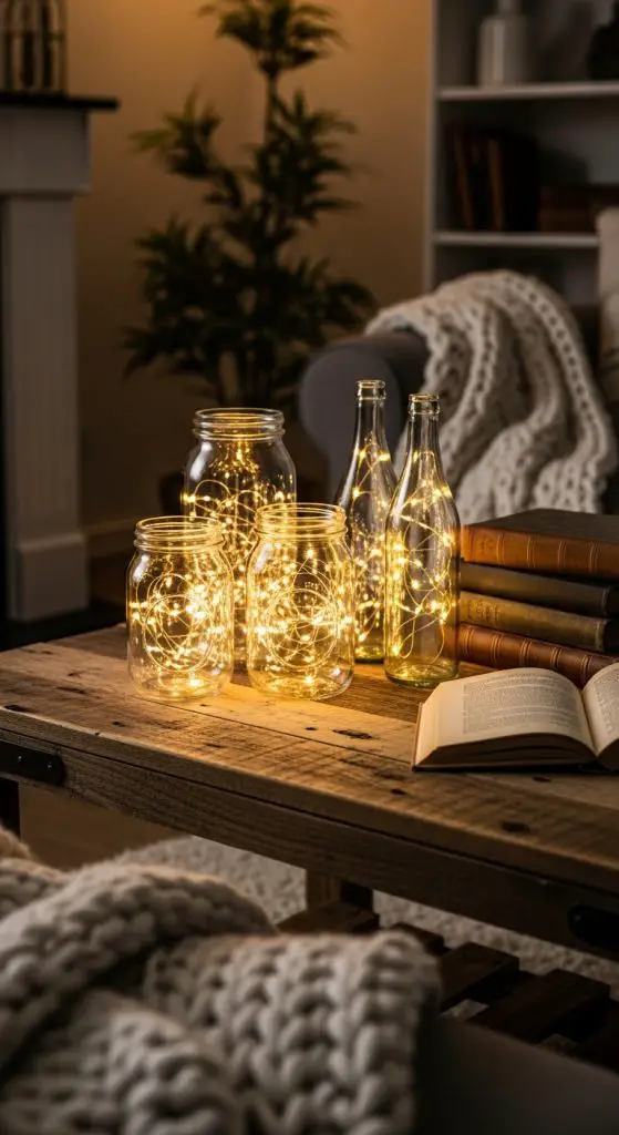 Grab some mason jars, wine bottles, or even old jam jars. Stuff them with fairy lights and boom—you’ve got instant glowing décor pieces.