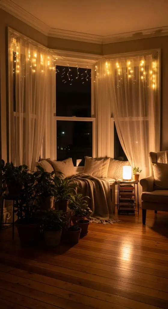 Framing your windows with fairy lights makes the whole space glow. At night, it’s like your living room is sending out good vibes to the neighborhood.