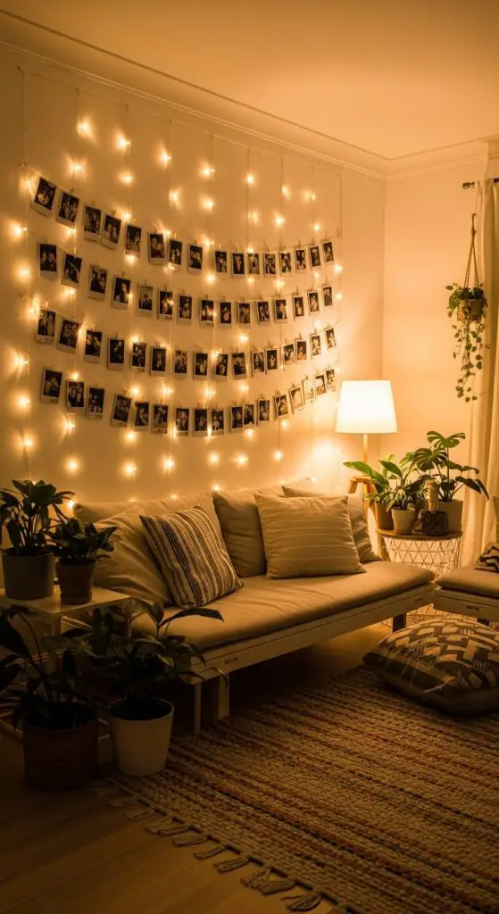 Attach fairy lights to the wall, then clip Polaroid photos or postcards onto them. Suddenly, you’ve got a glowing memory wall.