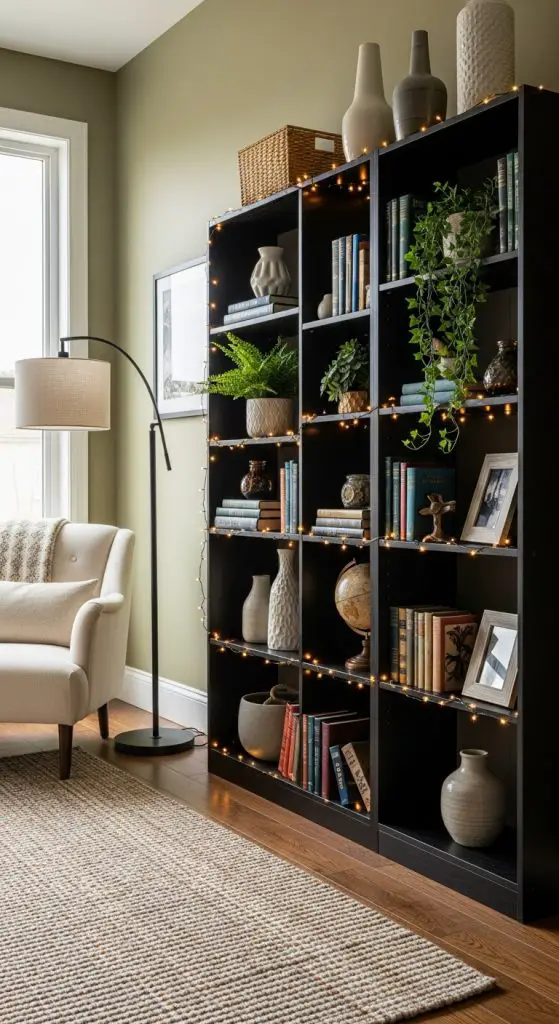 Line your bookshelves with fairy lights. It highlights your books, plants, and random trinkets while adding soft ambiance.