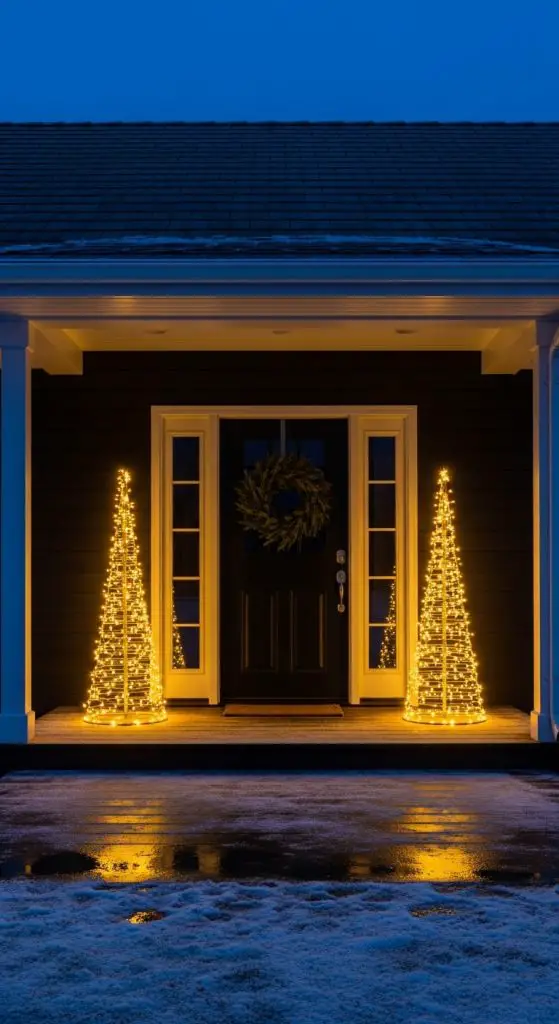 Wrap lights around cone frames or tomato cages to create glowing “trees” by your door. It’s simple, creative, and looks pro-level impressive.