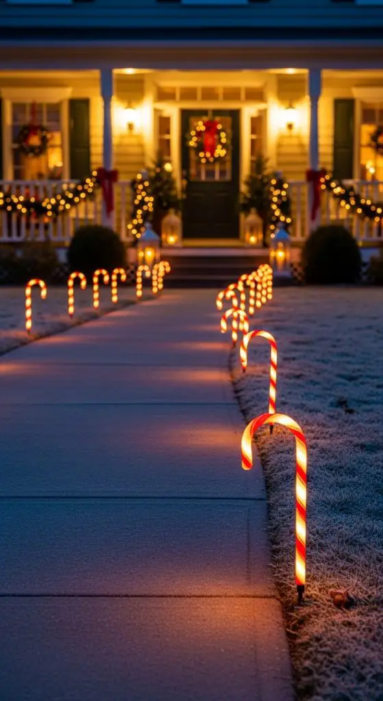 Line your walkway with candy cane stakes. It’s nostalgic, fun, and guides guests straight to your front porch like a sweet runway.