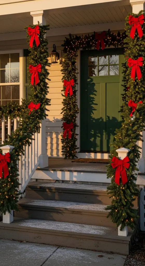Nothing says festive like railings wrapped in lush evergreen garlands. Add twinkling lights, and your porch will look straight out of a Hallmark movie.