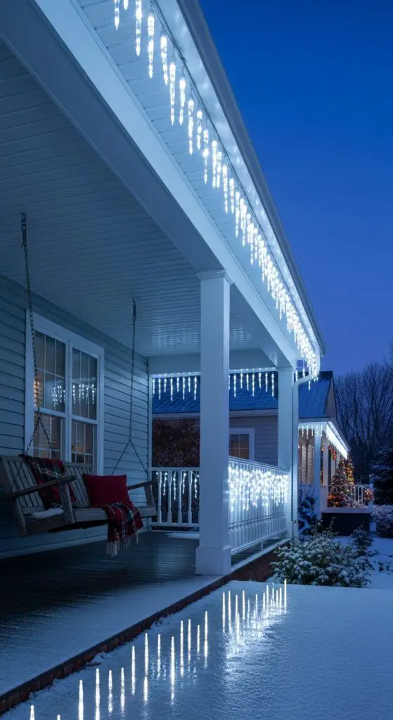 String icicle lights across your porch roofline for that classic frozen sparkle effect. Ever wondered why every holiday movie uses them? Because they work.