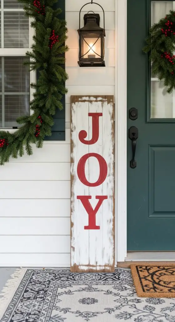 Think “Believe,” “Joy,” or even “Santa, Stop Here.” Wooden porch signs bring rustic charm without trying too hard. Plus, you can DIY with old pallets.