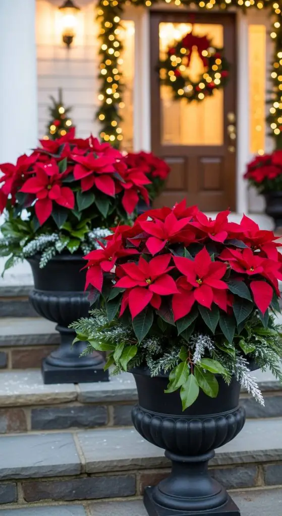 Swap summer flowers for big red poinsettias. Put them in urns or rustic baskets, and suddenly your porch feels like a botanical Christmas card.