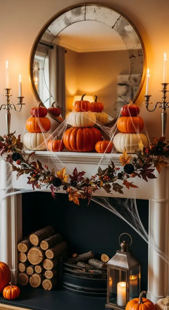 Mantels are like a stage for seasonal decorating. I layer mine with faux webs, tall candlesticks, and garlands. Guests always notice it first.