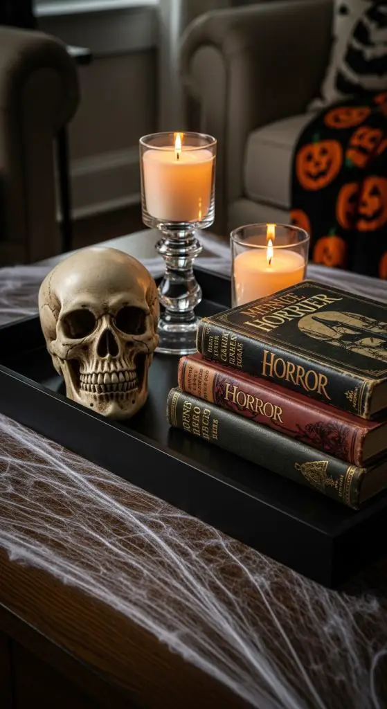 Style your coffee table with Halloween books, skulls, or themed trays to create a festive centerpiece.