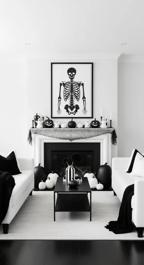 A chic black-and-white Halloween decor scheme creates a stylish, cohesive look that feels spooky without being cheesy.