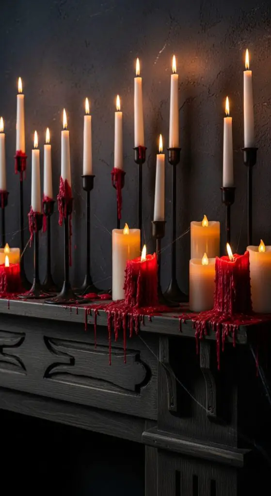 Candle displays create moody lighting perfect for Halloween living room decor. Black candlesticks, blood-red wax, or even LED candles set the tone.