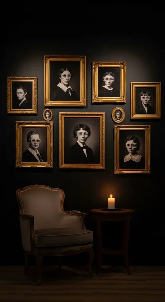 Ever wondered why haunted mansions in movies always have creepy portraits? Because they’re unsettling and stylish. I swap a few family photos with faux Victorian portraits that “change” when you walk past (yes, Amazon sells them).