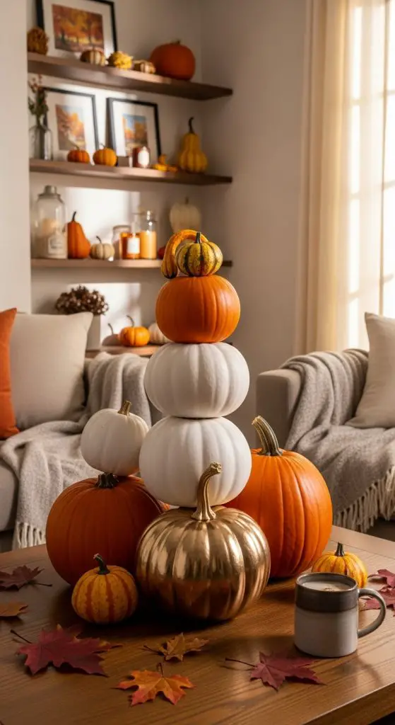 You can stack mini pumpkins on your coffee table, line your fireplace with gourds, or go bold with metallic-painted ones. I love mixing natural pumpkins with faux ones so the decor lasts longer.