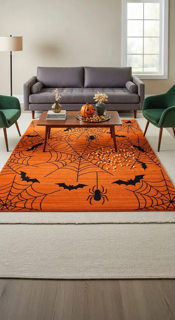 A seasonal rug with spooky patterns instantly anchors your Halloween living room decor and ties the theme together.