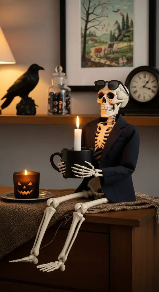 Adding skeleton figures—life-size or mini—creates playful, slightly creepy decor that doubles as conversation starters.