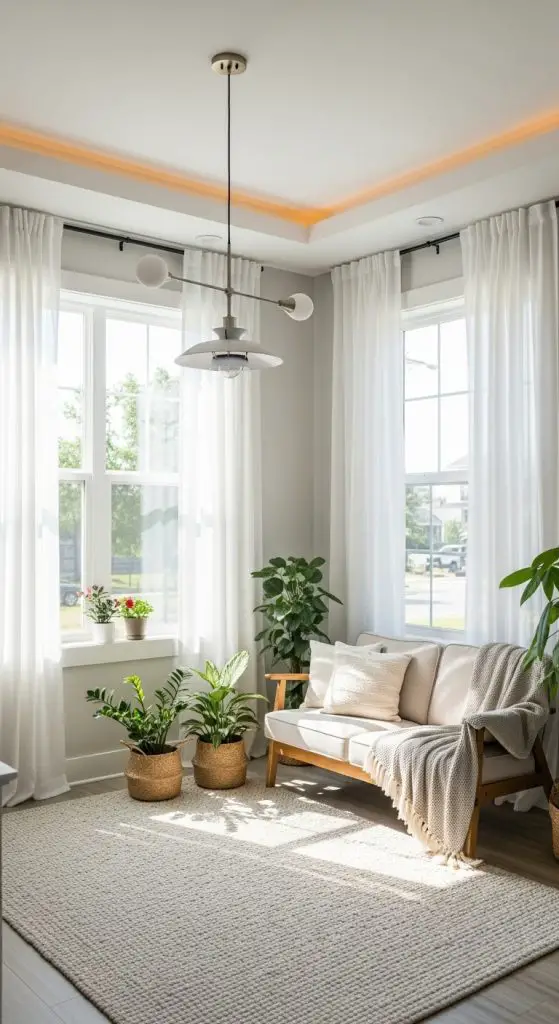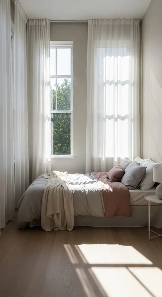 Pro tip: Match curtain color to your wall for a seamless, airy effect.