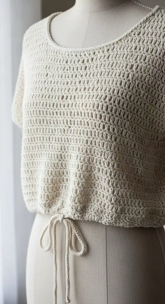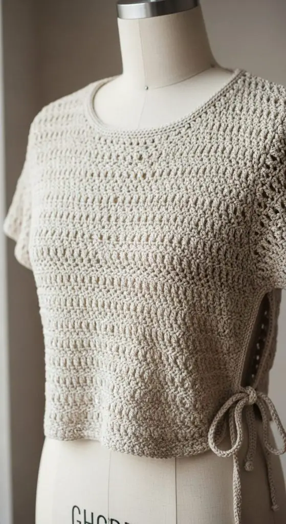There’s something undeniably charming about tops that allow a little adjustability, and linen side ties do exactly that. I first saw this design in a small boutique, and it instantly struck me as a clever solution for warm days when you want comfort without losing shape. Two knitted crochet panels connect with linen ribbons, forming a breathable, airy fit.