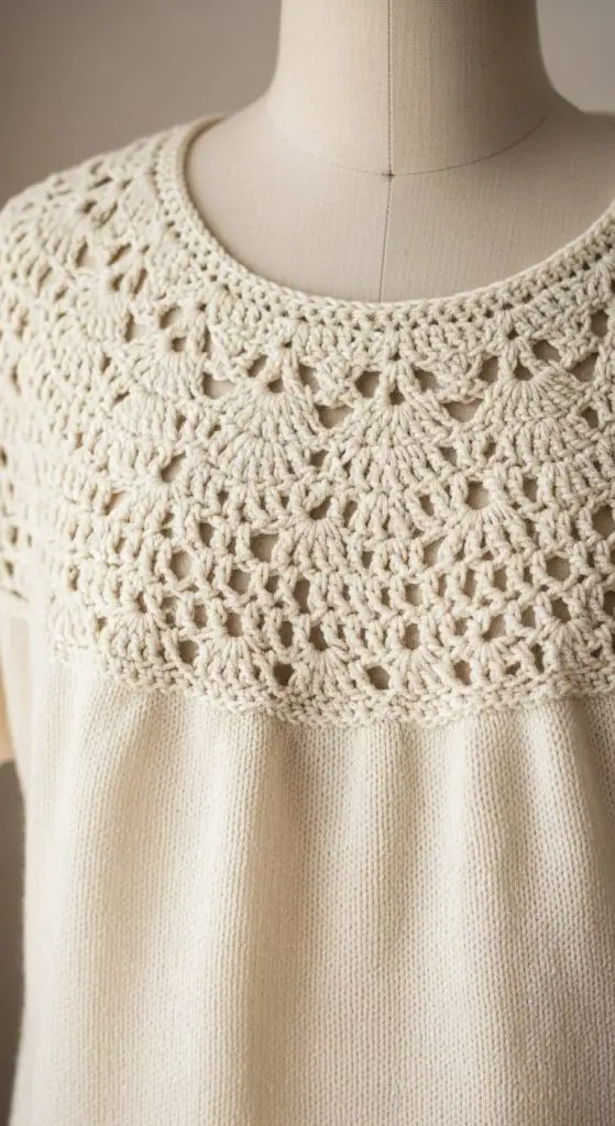 This idea blends the comfort of a knitted body with the ornate beauty of a crochet yoke. The crochet detail sits around the neckline and shoulders, giving the top a polished, feminine feel. A recent apparel trend report mentioned mixed-fabric tops gaining popularity over single-texture ones, which explains why this silhouette keeps showing up.