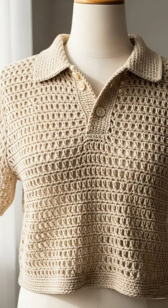 Imagine a lightweight polo but with airy crochet stitches instead of a solid knit. The collar gives it a sporty edge, while the open texture makes it perfect for warm days. It’s a fun twist on a classic shape.