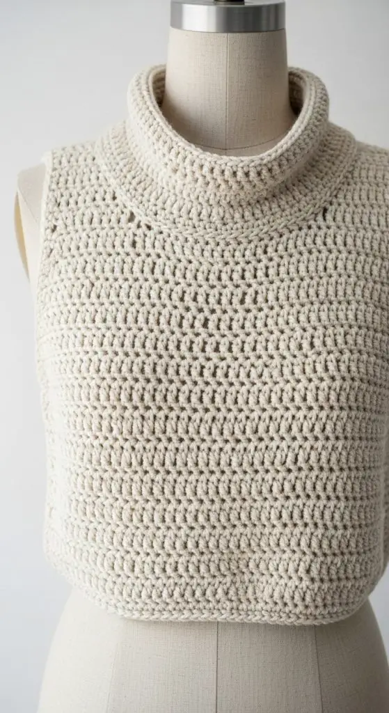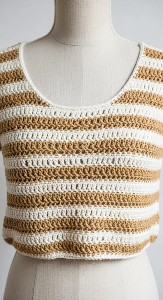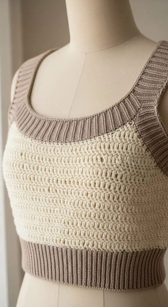 This style uses a crochet body with ribbed knitted borders around the hem, neckline, and armholes. It gives the top a refined look and helps maintain structure.