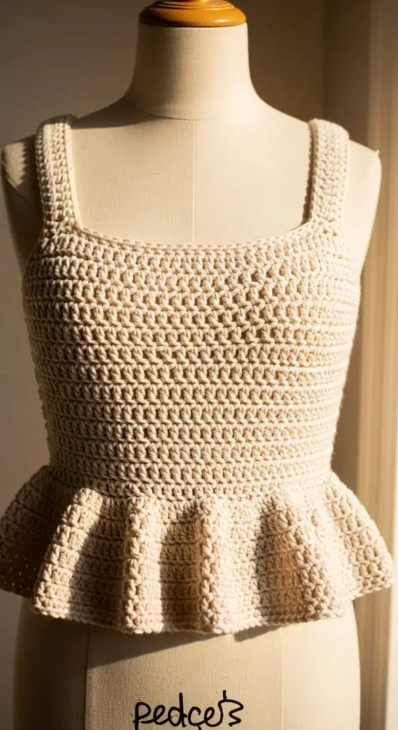 Peplums get a bad reputation, but in a soft knitted crochet stitch, they look gentle rather than dramatic. The subtle flare starts just below the waist, creating a balanced silhouette.
