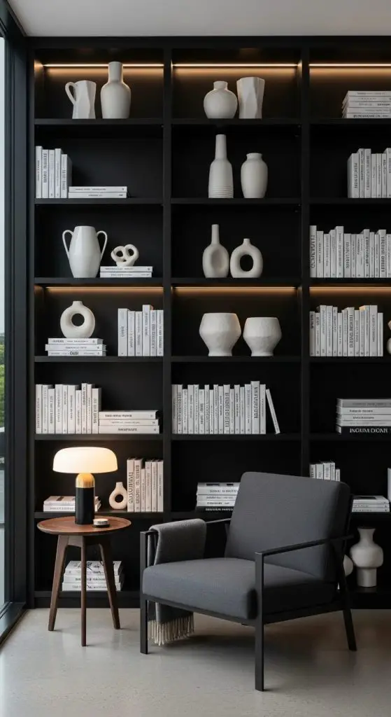 10. Black Bookshelves with White Décor