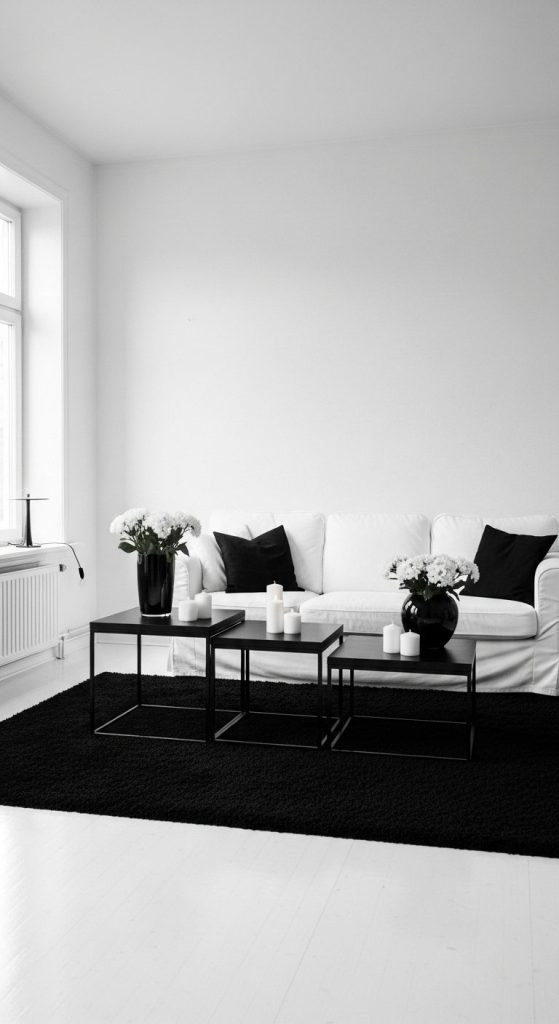 Coffee tables are underrated heroes. A black table styled with white flowers, candles, or trays is peak sophistication.