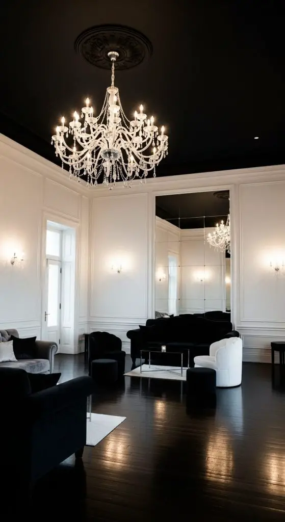 7. Black Ceiling with White Chandeliers