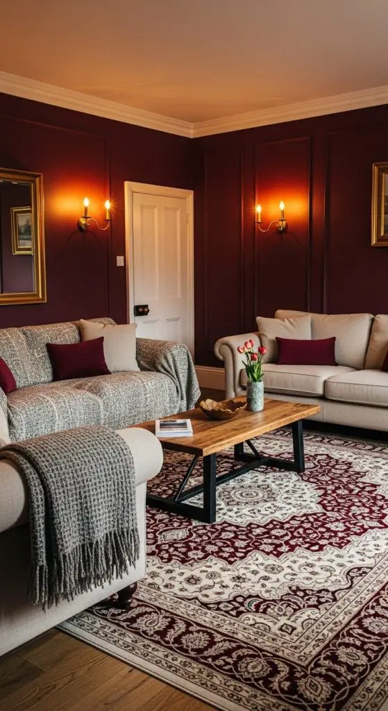 Burgundy feels indulgent, almost wine-glass-worthy. Cream balances it, preventing your living room from looking like a dark cave.
